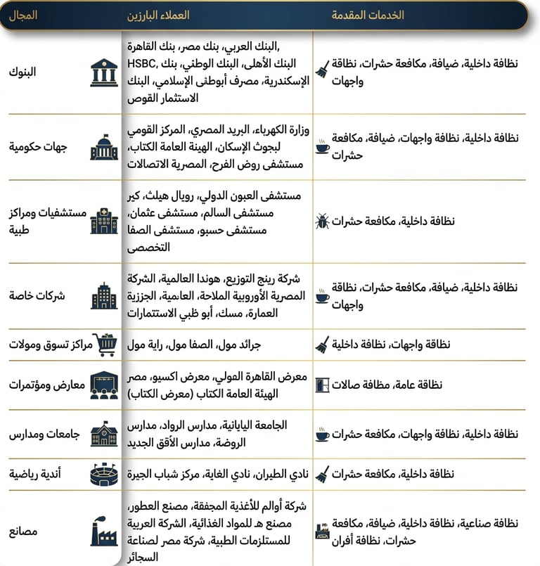تمثل سابقة أعمالنا إرثًا حقيقيًا من الثقة والاحتراف الذي نكتسبه يومًا بعد يوم. نحن نفخر بأننا شريك النظافة والخدمات المتكاملة لعشرات الجهات الرائدة في مصر، من البنوك والمستشفيات والوزارات إلى الشركات الكبرى والمراكز التجارية والمصانع. كل عميل في قائمتنا هو شهادة على التزامنا بالجودة، والدقة، والالتزام بالمواعيد، وفوق كل ذلك، فهم الاحتياجات الفريدة لكل قطاع. هذه القائمة ليست مجرد أسماء، بل هي قصص نجاح مشتركة، وأعمال نعتز بها، وعلاقات استمرت لسنوات. إنها الدليل الأقوى على أننا لا نقدم خدمات فحسب، بل نَبْنِي شراكاتٍ تدوم.